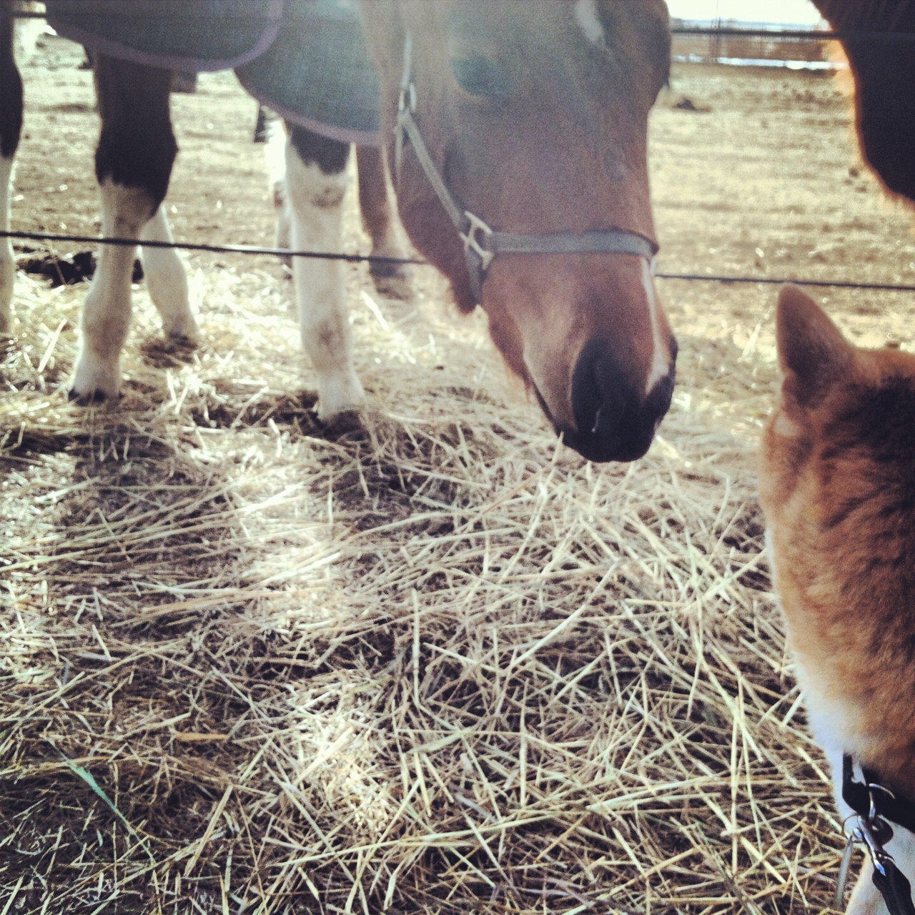 Copper has settled in very nicely. Each morning I wake up and take him for a walk around the property. We say hi to the horses and to the goat. We already have our favorites – and by we, I mean I have my favorites. There are some horses that are just lovers. They want to be loved on and stick their necks so far over the fence that you just can’t help but snuggle up to them. Copper has warmed up to the big beauties. He’s still unsure of what they are, but he tests his limits by sitting very, very close to them with his back turned away. If they get too close he’ll growl. The huge animals are no match for the tiny 23 lb ferocity of the Shiba Inu, thinks Copper 🙂