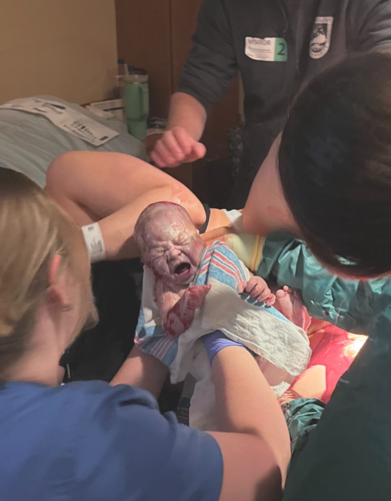 12:00 – 02:54am – Dr. F arrived to my room. There were 2-3 other babies being born at the same time! Time to have mine! Pushing while side lying, Ben holding my upper leg up to facilitate opening the pelvis. I refused to lie on my back. I also didn’t feel comfortable enough being on all fours because my epidural had worn off substantially, even with anesthesiology coming in multiple times to trouble shoot. I failed the entire epidural cold swab test (aka I could feel everything everywhere). Anesthesiology ended up turning it up. The issue wasn’t just the pain of the contractions…. for 10 hours now I had been having the excruciating round ligament pain off and on as if the ligament was being completely shredded during and after contractions. There was no relief. Because I was laboring on my right side, my left side where I was feeling the ligament stretching, was not numb at all due to the distribution of the epidural. This, along with back labor and epidural failure intermittently and position dependent = so much pain. I was also very discouraged at times that pushing was taking so long. I’d been up since 7am on the 23rd. 42+ hours…. Exhaustion was hitting hard. L and D nurses assured me there was no rush, baby and me were completely healthy, I’d have a baby soon, and to keep going. Ben, my doula Laura, L & D nurses, Dr. F — ALL were encouraging me and I am so thankful for them.